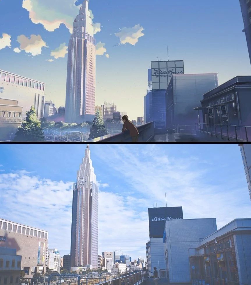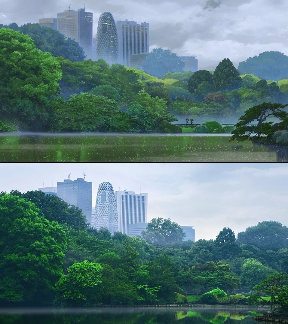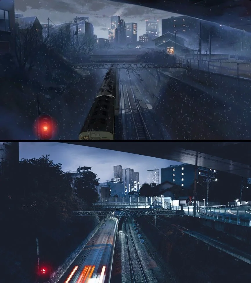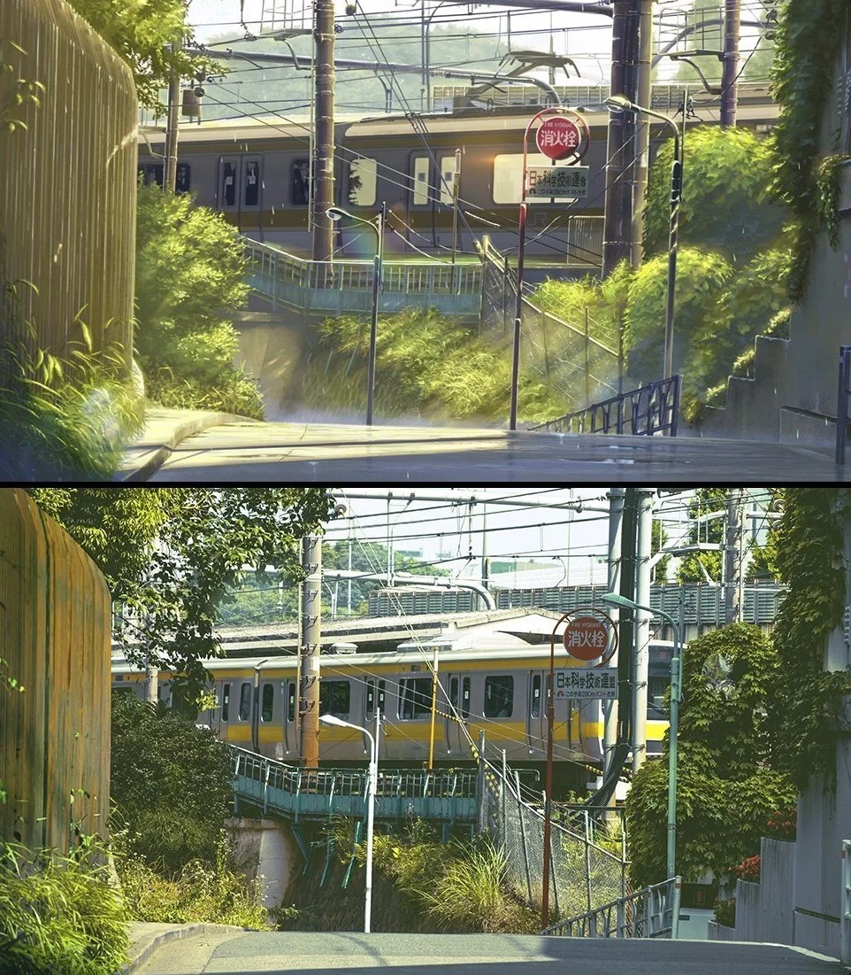 아래 비교 자료에서 보듯 그의 애니메이션 비주얼이 실제 대상이 되는 장소와 매우 가깝게 묘사하고 있다. 애니메이션의 시작점이 反 리얼리즘이라는 것을 고려하면 상당히 흥미로운 지점인데, 그 이유는 우리가 쉽게 스쳐 지났던 일상의 순간들을 섬세하게 드러내 보여주고자 하는 것에 목적이 있기 때문이라고 한다. 또한 이때 일상의 사물들과 그것을 비추는 빛을 세밀하게 묘사함으로써 서정적 느낌을 극대화하기도 한다.