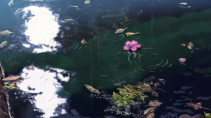이 같은 배경의 빛에 대한 묘사는 최근 작품 [언어의 정원]에서 극에 달한다. 이렇게 그는 비가 오는 배경에 주인공이 느끼는 그 감정을 오롯이 그 색감에 담아내기 위해 빛에 따라 아름답게 변하는 모네의 색감처럼 담은 것이다. 그리고 한편으론 이것을 보고 느끼는 관객의 감정은 신카이마코토가 사춘기 시절 느꼈던 감성이기도 하다.