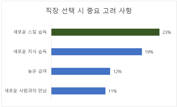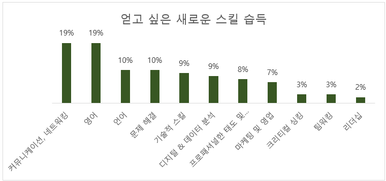 그런 이유로, 이들은 신입사원 단계에서는 업무에 필요한 직무 기술을 배우길 원한다. 입사 첫해 직무기술(skill)을 배우며, 경험을 통해 지식(knowledge)을 확장하며 성장하고 싶어한다. 이들이 배우고 싶어하는 구체적인 스킬은 위 그래프의 오른쪽에 있는 것처럼, 커뮤니케이션과 네트워킹, 언어를 주요하게 꼽았다. 여기서 커뮤니케이션 및 퍼블릭 스피킹이 배우고 싶은 기술 1순위가 된 이유는, 이들에게 익숙한 비대면 방식의 커뮤니케이션과 다른 영역이기 때문이라 추측된다. 기본적으로 Z세대들은 대면 커뮤니케이션을 선호하지 않는다. 그래서 인스턴트 메시징을 직장내 가장 선호하는 커뮤니케이션 방식으로 선택하고 있다.