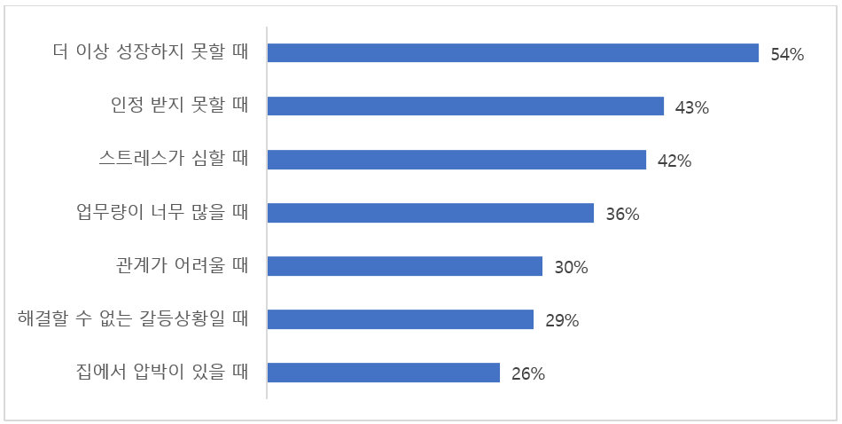 이렇게 피드백에 가치를 두는 것은 곧, 자아실현의 과정에서 인정을 받고 싶은 욕구와도 연관되어 있다. Z세대와 함께 일할 때는 이들의 자아실현 욕구에 맞게 창의적으로 콘텐츠를 개발하게 하면서 지속적으로 피드백을 통해 인정해 줄 필요가 있다. 아래 그래프는 Z세대가 번아웃을 느낄 때인데, 이 역시 성장 및 인정 욕구와 연계된다.