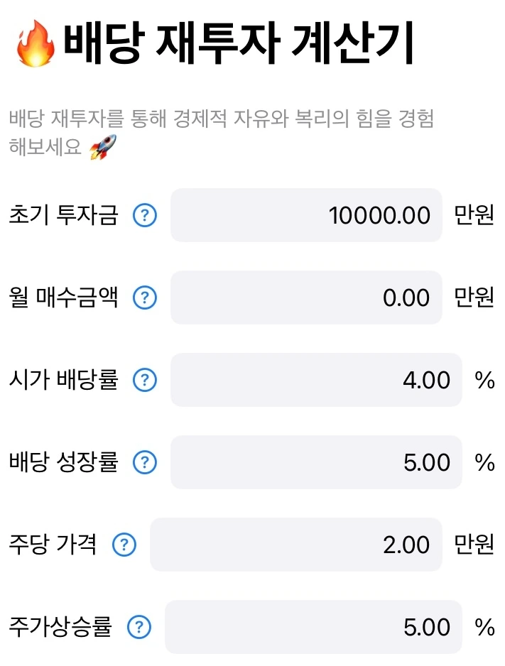 1. 5년 동안 1억 원을 모아 추가 납입 전혀 없이 배당만 재투자하는 것으로 정한다.