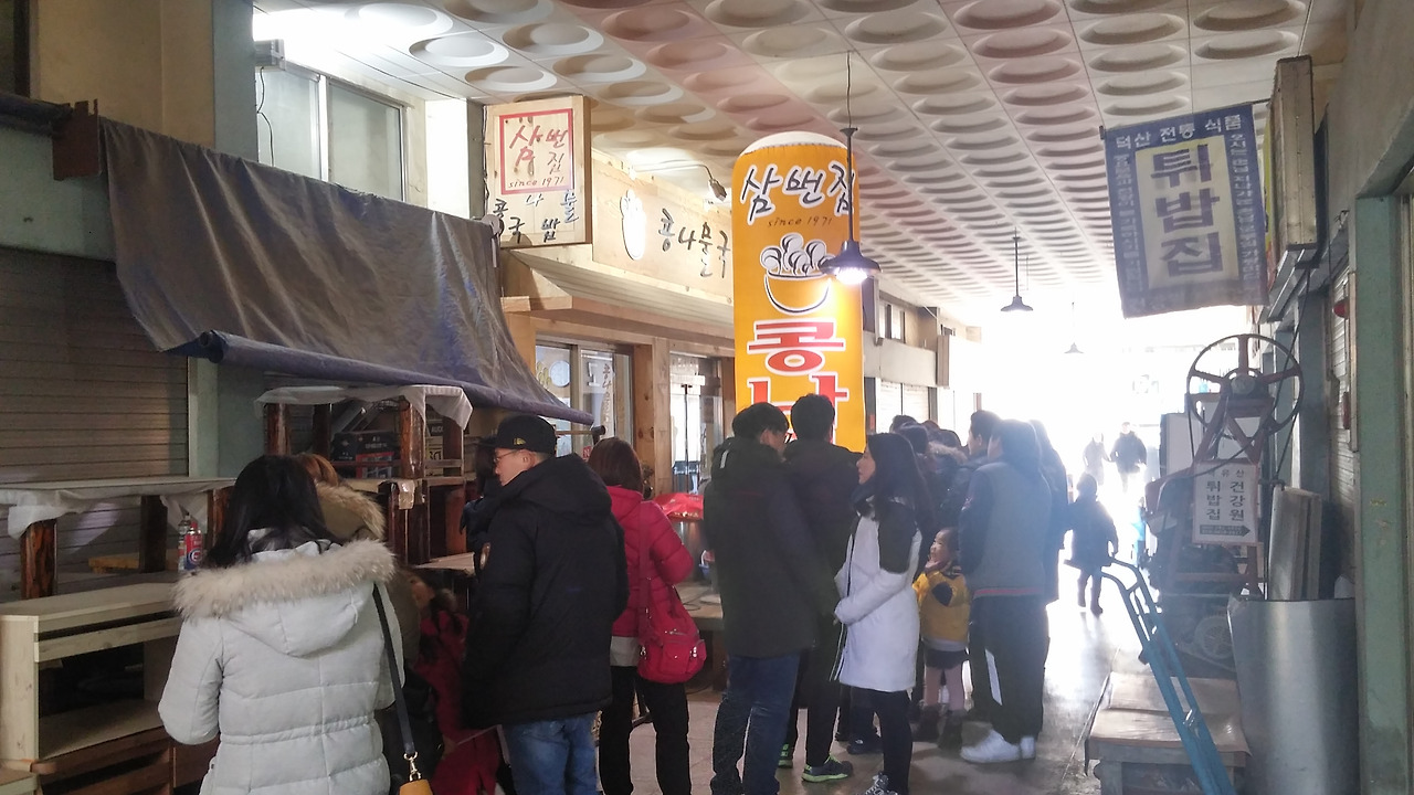 한옥 마을을 가로질러 가다 보면 남부시장이 나온다. 옛날 시장 느낌이 나는 곳이며 우린 출출하니 콩나물 국밥이라도 한 그릇 하기로 한다. 아내가 빠르게 검색해보니 이 시장에는 유명한 콩나물 국밥 집 하나, 유명한 피순대 집이 하나 있다고 한다. 물론 콩나물국밥과 피순대를 파는 가게가 그 집들 외에도 매우 많이 있다. 다만 어떠한 연유로 매스컴을 탄 가게에만 연일 손님들이 끊이질 않으며 문전성시를 이루고 있다. 얼마나 맛있는지는 모르겠으나 사람들은 30분이고 한 시간이고 계속 줄을 서서 기다린다. 빠른 순환을 요구하는 이러한 시스템에 주인들이 친절 할리 만무하다. 또한 이 가게 하나로 인하여 주변 여러 가게들의 생존을 위협할 수도 있다는 느낌이 강하다. 우리야 기다리지 않았기에 진짜 그 정도로 맛있는지는 알 길이 없다. 하지만 유명하다는 맛집과 주변에 동종 업계의 다른 집 음식을 가져와 블라인드 테스트하였을 때, 과연 차이가 있을까?? 정말 틀릴까?? 우선 첫 번째로는 틀리지 않을 것이라는 확신을 하고, 두 번째로는 아무리 맛있어서 황제가 먹던 것이라 할지라도 먹는 것에 30분 이상 투자하는 건 나에게 있어 사치이다. 옆에 한 블록만 건너가 보니 또 다른 콩나물 국밥 집이 나온다. 역시 유명하다는 맛집 한 곳 빼고 다른 가게들은 상대적으로 손님이 없다.