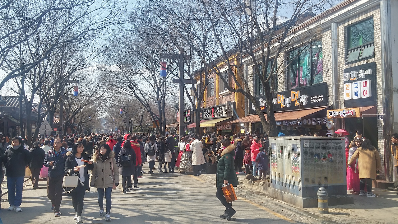 한옥마을은 오전부터 방문객들이 적지 않았다. 친구들끼리, 가족끼리 , 연인들끼리 등 다양한 부류의 사람들이 있었으나 상대적으로 외국인은 많지 않았던 것 같다. 아래 사진처럼 양쪽으로 한옥 건물들이 쭉 늘어서고 있으나 옛 건물들이 아닌 단순히 옛 건축양식을 따서 지은 요즘 건물 느낌이 강하다. 이곳에 와서 절대 먹어보아야 하는 음식이라고 입소문 탄 것들은 만두, 문어꼬치 등 다소 뭔가 전통 과는 거리가 멀다.