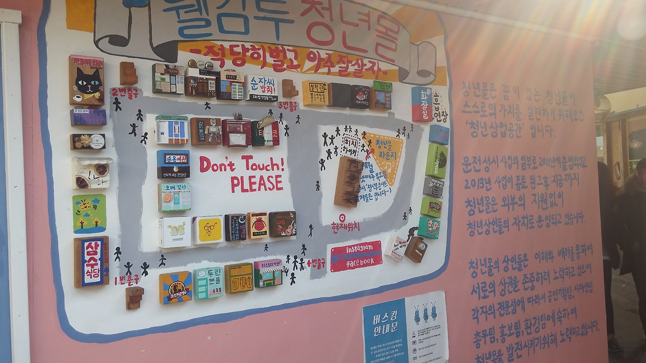 남부시장 2층으로 올라가니 창업 청년들이 모여서 청년몰을 이루고 있는 장소가 나온다. 꿈이 있는 청년들의 창업 공간이었으며, 문전 상시 사업으로 2011년부터 시작되어 2013년까지 이어졌으나 그 후로는 정부나 시 등의 외부 지원 없이 청년들 독립적으로 이어 오고 있다고 한다. "적당히 벌고 아주 잘 살자"라는 슬로건으로 운영되고 있는 이곳은 곳곳에 아기자기한 모습으로 각자만의 아이템을 가지고 조그마한 상점들을 운영해 나가고 있다. 아기자기한 모습들이 상당히 인상적인 곳이었다. 항상 그들을 응원하겠다는 작은 마음을 먹고 돌아나온다.