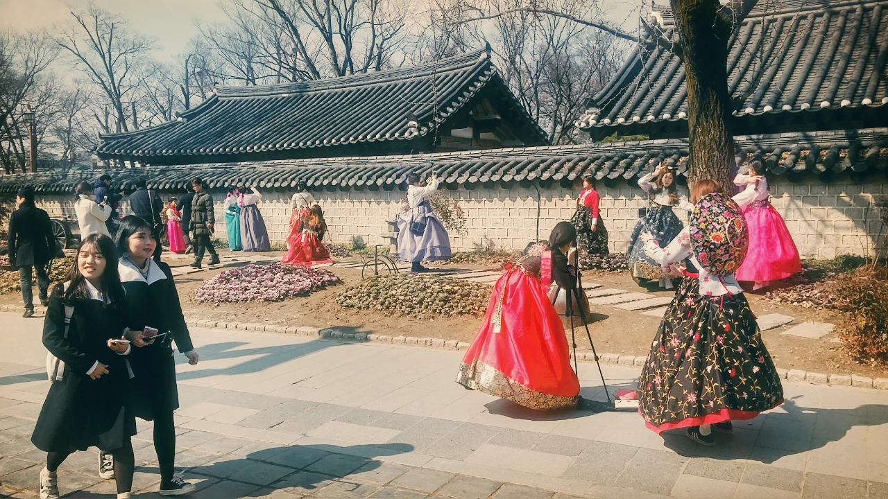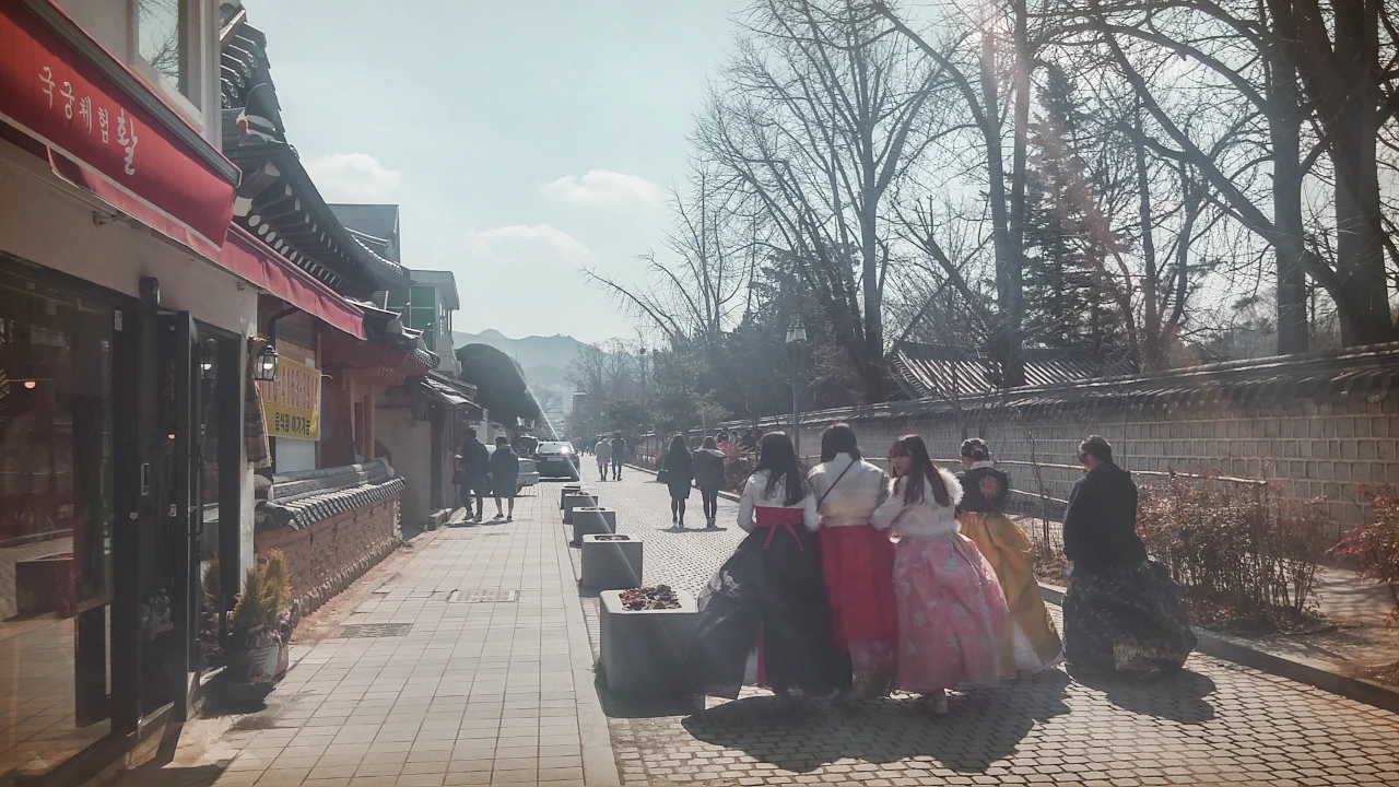 요즘은 매스컴의 영향을 많이 받는 시대이다. 내 기억에 사진에서 보듯이 관광객들에게 한복을 대여해주고 옛날 교복을 대여해주는 것이 성행하게 된 것은 한 유명 방송 프로그램에 나오면서 부터였던 것으로 기억된다. 그 뒤로 여길 찾은 것은 이번이 처음이지만 역시나 굉장히 많은 한복/교복 대여점들이 자리 잡고 있었으며, 이용하는 관광객들도 상당히 많았다.너도 나도 그런 분위기를 즐기는 듯하였다. 이렇게라도 한복을 입어보고 사진으로 남겨놓는 것은 아마 이곳 아니면 쉽지 않을 것이라고 생각되니 이런 문화를 굳이 상업적이라고만 보면서 비판할 필요는 없을 것 같다. 이 곳을 방문하는 사람들에게 이 한옥 마을은 일종의 놀이터라는 느낌이 든다. 조금 다른 놀이터, 도심에선 볼 수 없었던 낯선 놀이터, 도심에선 입어보지 못했던 낯선 옷들..그 이유만으로도 충분히 즐거운 시간들을 보내고 있는 듯하다. 우리에게는 즐거워하는 그 사람들, 먹기 위해 줄을 길게 늘어서는 사람들이 더 이색적인 풍경이었던 것으로 기억된다. 여전히 우리는 산책하는 나그네 포스로 이곳 저곳을 배외해 본다.