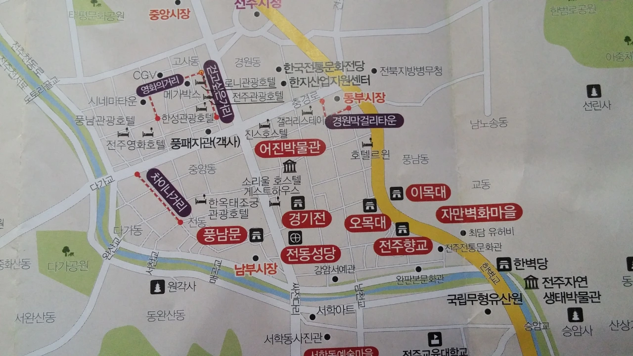 게스트 하우스에 있던 지도 한장 들고 우린 여행을 아니, 산책을 하기 시작하였다. 크게 한 바퀴 돌아보면서 정취나 느껴보고 가자였던 것이다. 내가 15년도 더 된 옛 기억을 가지고 있는 탓일까? 이곳은 이미 많은 변화를 겪어왔으며 이젠 상당히 상업적인 느낌이 훨씬 강한 곳이 되어버렸다. 지도 속에 나와있는 차이나 거리, 영화의 거리, 걷고 싶은 거리 등은 이름에 비해 관리가 전혀 안되어 있으며 볼거리 또한 없어 보인다. 모든 것은 경기전과 전주향교를 사이로 번화하고 있었다. 그래도 많이 변했다는 뜻이지 나쁘게 변했다는 뜻은 아니다. 시대 흐름에 맞춰 변해가는 것은 어찌보면 자연스러운 일일테니..