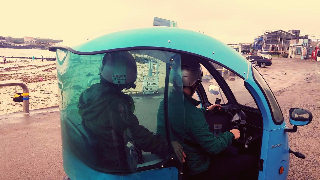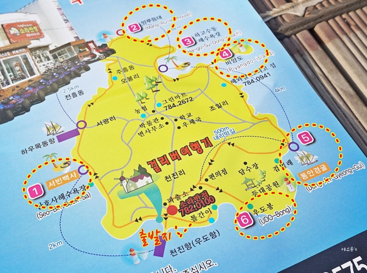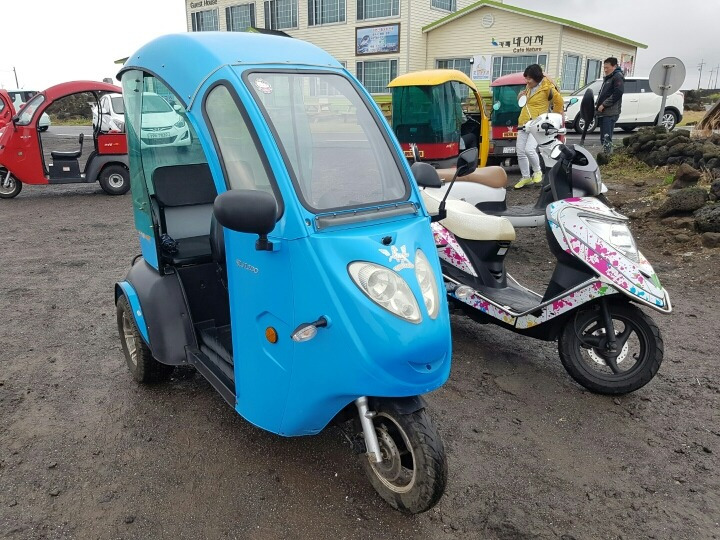 스쿠터는 2시간 기준으로 금액이 측정되며 이후 늦어진 시간만큼 추가 금액을 내는 시스템이다. 빠르게 돌아볼 마음이라면 2시간이면 얼추 한 바퀴 돌아보기에는 충분한 시간이라고 생각된다. 조금 더 여유를 가지고 자세히, 천천히 돌아가고 싶다면 자전거 혹은 두발에 의존하는 것도 훌륭한 방법이 되겠다. 우리는 1인승 스쿠터 하나와 사진에 있는 것과 같이 2인승짜리 개조된 스쿠터를 빌려 한 바퀴 돌아보기로 한다. 2인승 스쿠터의 최대 속도는 30km/h 이므로 젊은 사람들에겐 다소 답답한 속도일 수가 있으니 본인 취향 및 역량에 따라서 선택하면 되겠다. 우도항에 내리면 앞에 수많은 스쿠터/자전거 대여소들이 있으며 입맛에 맞는 가게를 고르면 되겠다.