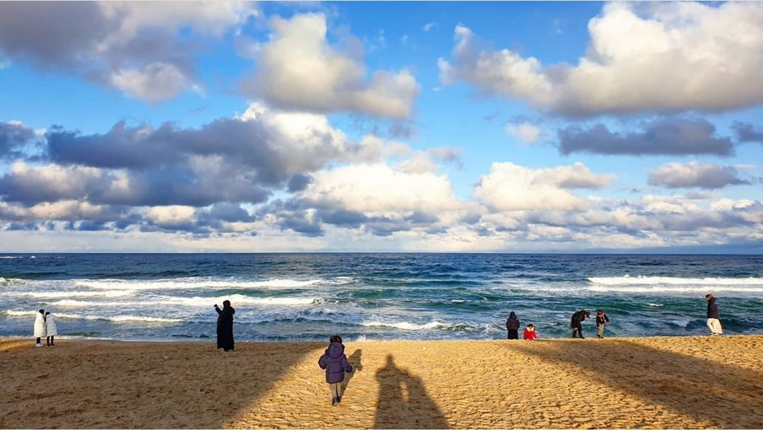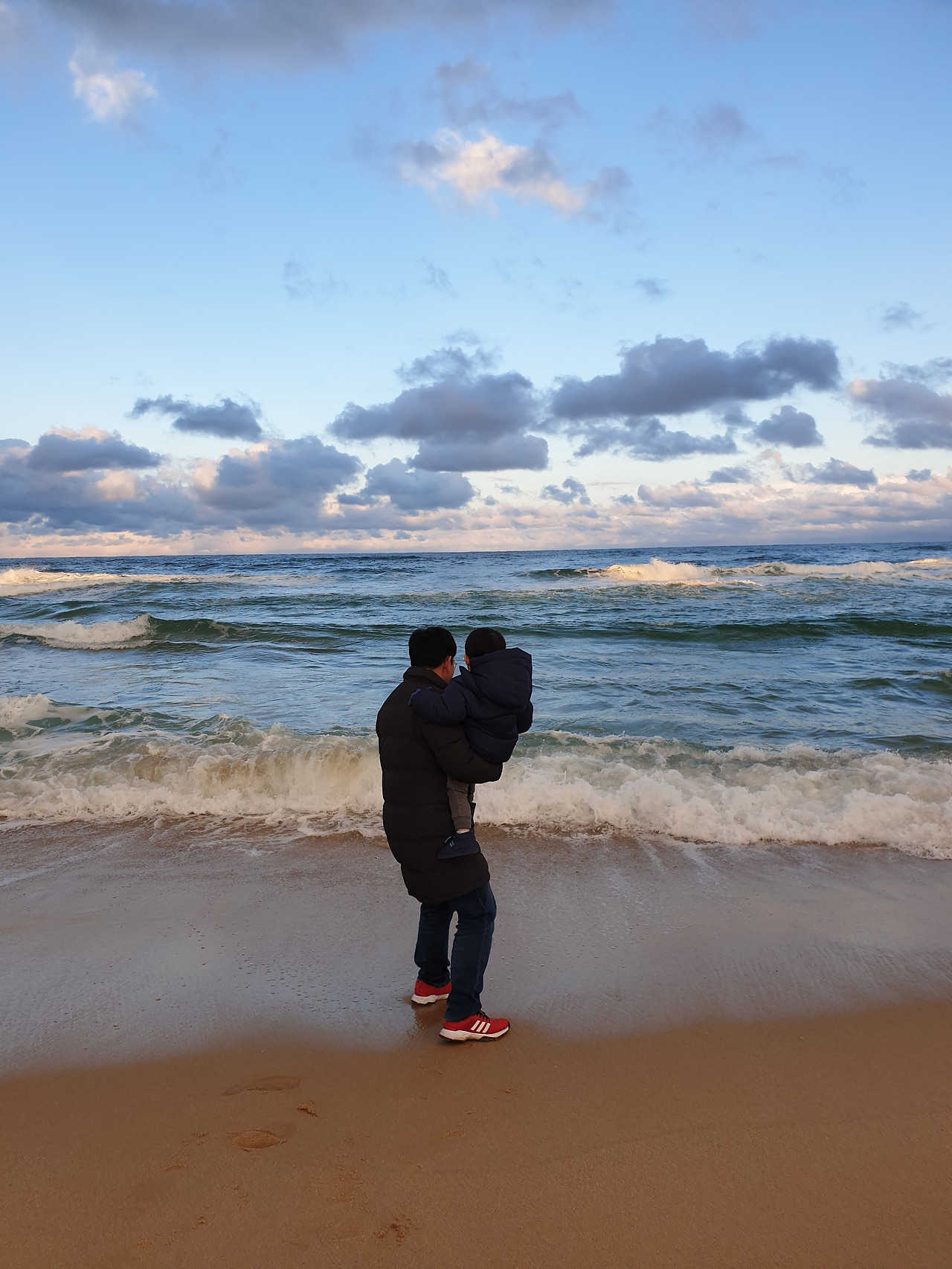 이날 동해는 여태 본 동해 바다 중 거의 손에 꼽힐만한 비주얼을 보여주고 있었다. 첫째에게 동해 여행은 처음이라 그런지 유독 신나하는 정도가 컸다. 조개도 줍고 모래바닥에 그림도 그리며, 연신 파도와 밀당을 하면서 시간 가는 줄 몰라한다. 동생이 나온 뒤로는 어디 멀리 떠난 적이 없으니 이번 여행이 내심 즐거운 모양이다. 우리 아버지 때는 그냥 보이는 것이 전부 놀잇감이었고 놀이터였다고 하였다. 나 때는 그 정도는 아니더라도 뛰어놀 수 있을 정도로 넓고 애들이 바글바글한 놀이터가 잘되어 있었다. 요즘은?? 놀이터에서 아이들을 찾아보기 힘들고 키즈카페가 요즘 애들에겐 최고의 놀이터이다. 다들 어린이집이며, 유치원을 마치고 집에 오더라도 축구 교실, 태권도, 발레 등 다양한 사교육들이 벌써부터 시작되는 모양새이다. 비용을 지불해야지만 뛰어놀 수 있는 환경이 주어진다. 그런 애들에게 주기적인 이런 환경 제공이 점점 더 중요하다고 생각된다.