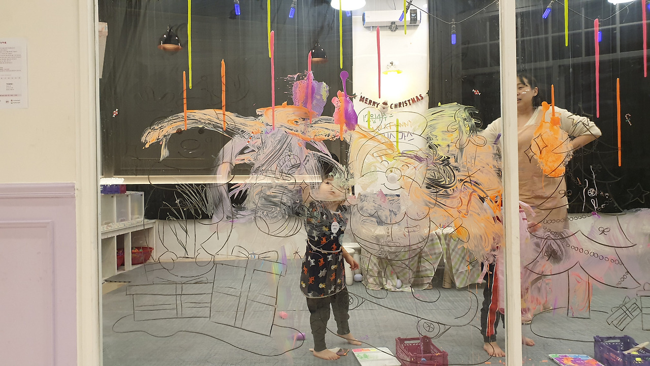 물감으로만 하는 색칠 위주의 프로그램이 전부가 아니라 만들기, 종이 더미에서 바람을 이용해 보기, 크리스마스 등과 같은 때에는 그에 맞춤형 이벤트들이 준비되어 있다. 한번 체험을 시켜 본 뒤에 아이의 반응이 나쁘지 않아서 10회권을 구매했고 매주 바뀌는 프로그램을 모니터링하다 필요할 때마다 적절히 잘 사용하고 있는 중이다^^.