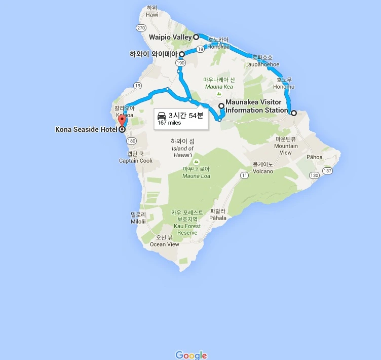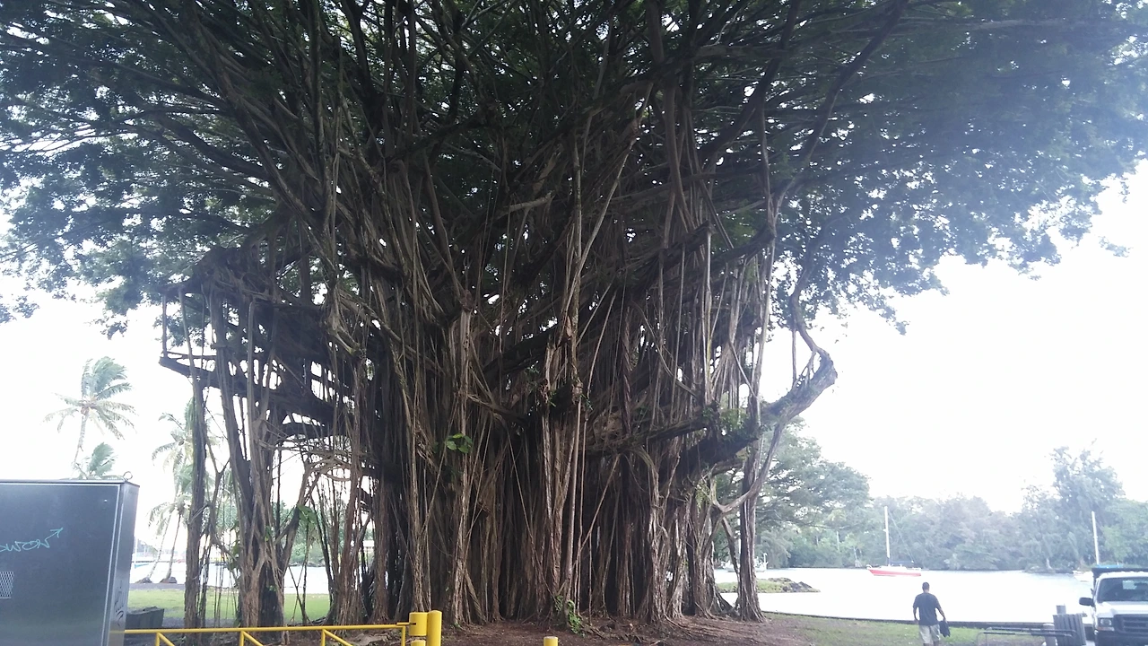 우리가 묵은 Hilo Sea Side 앞으로는 바다가 바로 보이기 때문에 출발 전에 주변을 둘러보았다. 가볍게 산책하는 것으로 금일 여행을 시작해 본다. 진정한 반얀트리가 넓게 도로변을 따라 자라나고 있는 진 풍경이다. 오늘의 주요 거점은 바로 와이피오와 세계에서 해발고도가 제일 높다는 마우나 케아이다.
