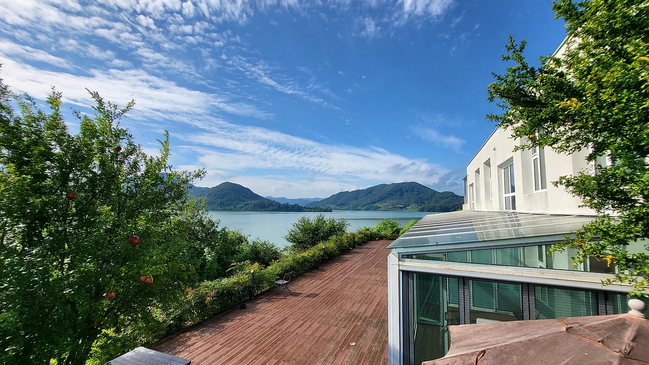 창밖으로 들어오는 햇살과 호수 풍경이 잠을 깨운다.