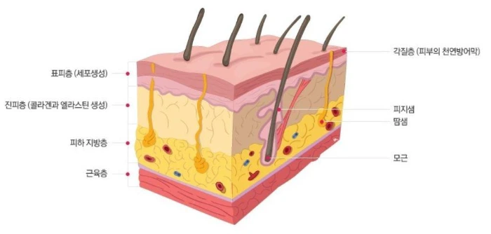 우리 신체 기관을 보호하는 기능을 담당하는 피부는 크게 3개의 층으로 구성되어 있습니다. 가장 안쪽의 피하조직, 그리고 모세혈관과 땀샘이 존재하는 진피, 가장 바깥쪽의 표피가 그것입니다. 그 중 표피는 대부분이 각질형성세포로 이루어져있으며 외부자극으로부터 몸을 보호하는 가장 일차적인 방어벽이자 피부의 수분의 증발을 막는 보호막의 역할을 하고 있어요. 일종의 피부의 텐트 같은 역할을 해주고 있기 때문에 표피의 역할은 매우 중요합니다.