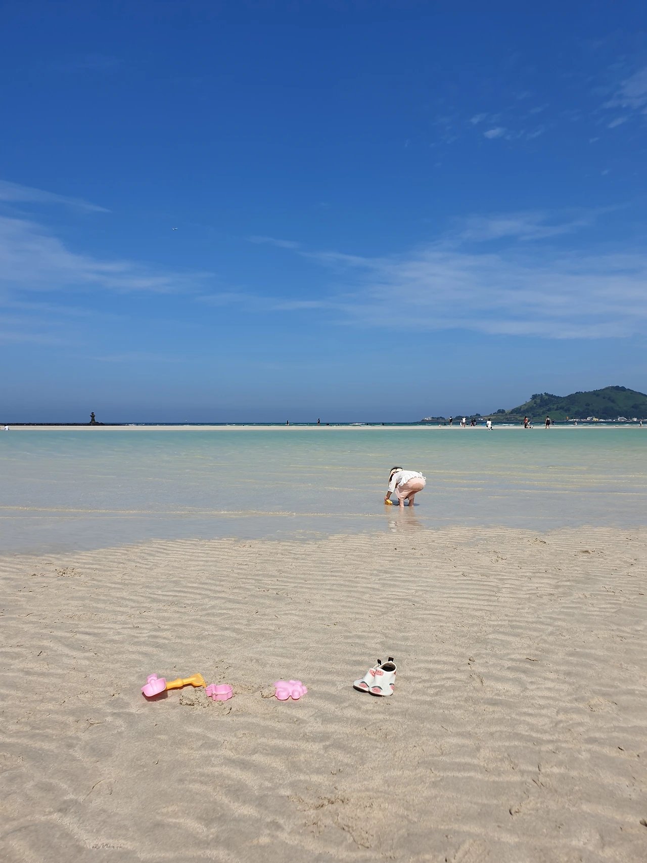 셋째 날은 금능해수욕장에 갔다. 한여름이 아니라 물놀이는 못했지만 모래사장에 앉아 한참을 놀았다. 바지를 다 적셔가며 모래성을 쌓는데 여념이 없는 수아, 비행기가 엄청 가까이 보인다며 하늘 사진을 찍는 신랑, 그리고 그걸 바라보며 행복한 나까지 모든 게 완벽했다. 우리는 바닷가를 보니 비로소 진짜 제주도 여행 온 거 같다며 웃었다.