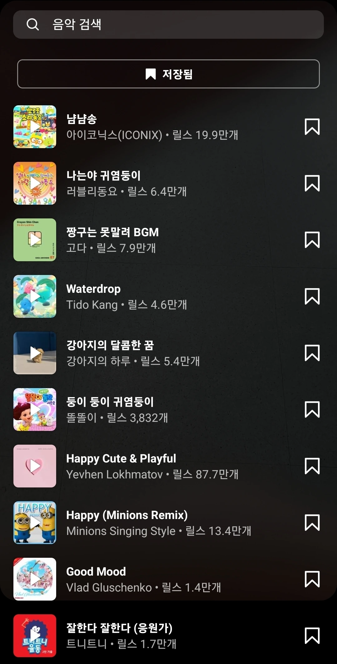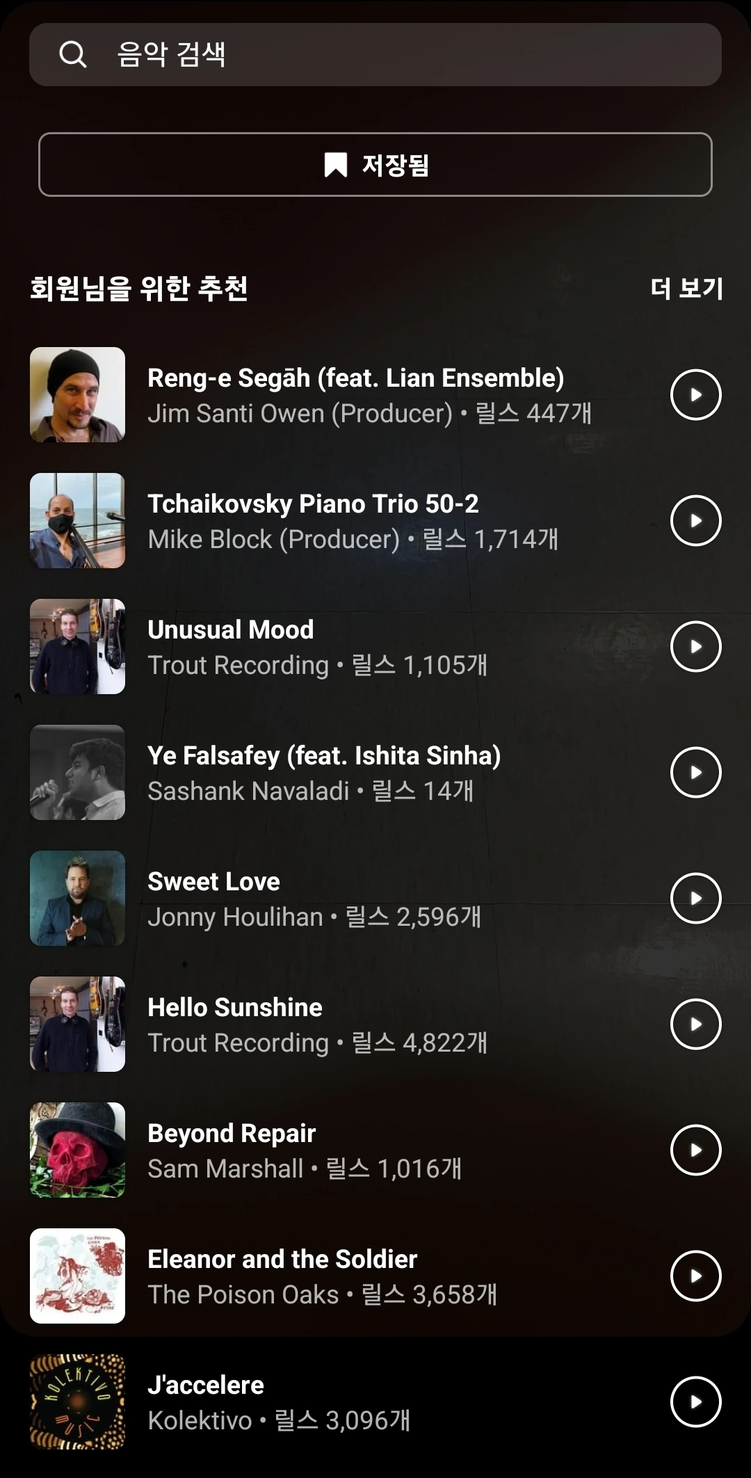 프로페셔널 계정은 릴스에 사용할 수 있는 음악이 한정적이다. 아이돌, 가요 등 저작권 문제가 발생할 수 있는 음악은 쓸 수 없다. 내게 남은 선택지는 낯선 외국 음악들 뿐이었다. 외부 편집 채널에서 아예 음악을 입혀서 만든 영상을 업로드할 수도 있지만, 우선은 안전하게 릴스에서 제공되는 음악으로 제작해보기로 했다.