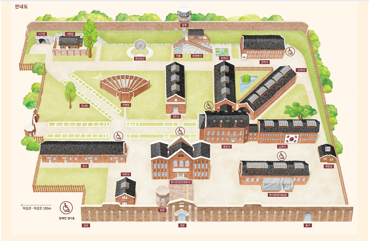 서대문형무소에는 전시관 중앙사 취조실 사형장 옥사 한센병옥사 격벽장 공작사 우물 노역장 등이 있었다.