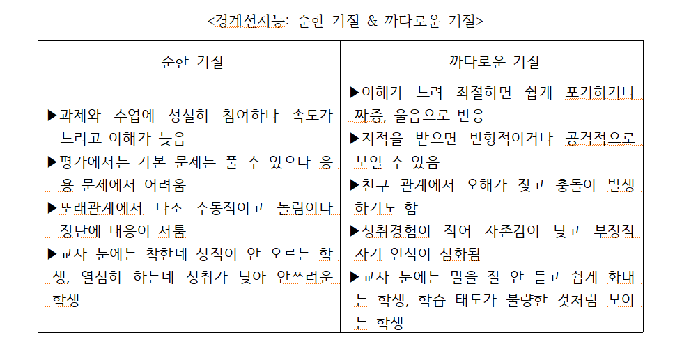 경계선지능을 순한 기질과 까다로운 기질로 나누어 생각해 볼 수 있는데, 같은 경계선지능인이어도 그럭저럭 지낼 수 있는 학생이 있고 까다롭고 친구관계 충돌이 많은 학생도 있다.