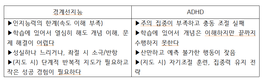 그러나 경계선지능과 ADHD는 도움을 받아야 하는 방향이 다르기 때문에 어려움의 핵심을 잘 살펴야 한다.