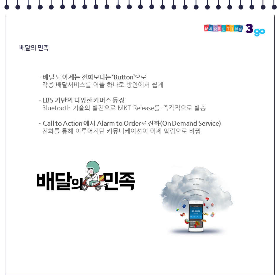 이외에도 다양한 브랜드가 고객에게 우리 브랜드를 경험시키기 위해 최대한의 노력을 기울이고 있습니다. 특히 오프라인 기반의 온라인 제공 서비스인 O2O 관련 서비스의 경우, 이런 부분에서 신중함을 기울이고 있는데, 대표적으로 배달서비스의 선두주자인 '띵동'과 다른 성격이지만, '배달의 민족' 또한 고객의 상황을 고려한 브랜드 경험을 최대화 하는 것을 통해 niche Market을 개발하고, 이를 통해 지금까지 시장에서 건재함을 과시하고 있습니다.