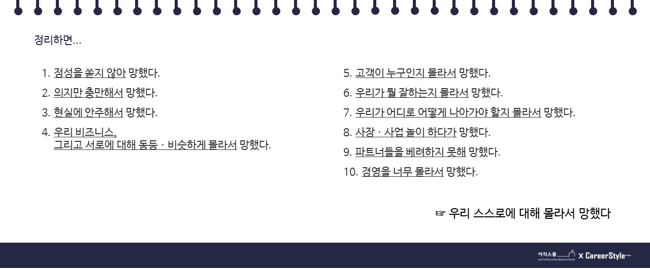 저는 그걸 게을리 하면서 망했습니다. 길을 찾고 명확하게 그려내고 항상 우리가 가진 본래의 가치에 집중하며 계속해서 고객의 관점에서 점검해야 하는데, 지금 당장의 성공에 목 말라 혹은 오늘 해야 할 일에 취하면서 사업의 균형을 잃었습니다. 그렇게 원하지 않는 방향으로 흐르게 됩니다.