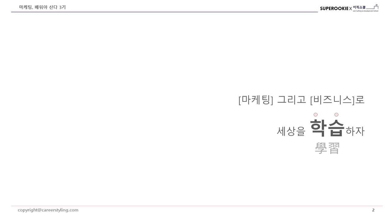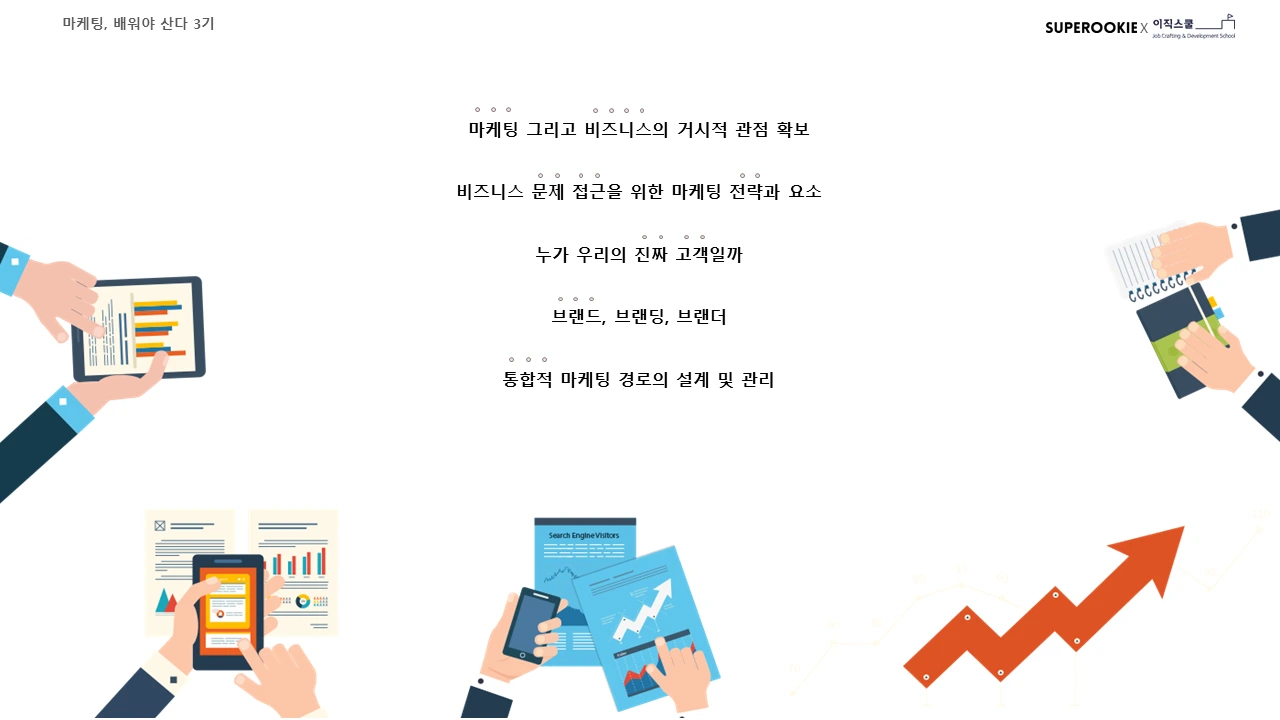 누군가 "마케팅이 뭐야?"라고 했을 때, 자신 있게 이론적 기반에 충실한「마케팅, 브랜딩, 비즈니스 OOOO이다」라고 자기만의 언어로 말할 수 있도록 만들어진 과정입니다.