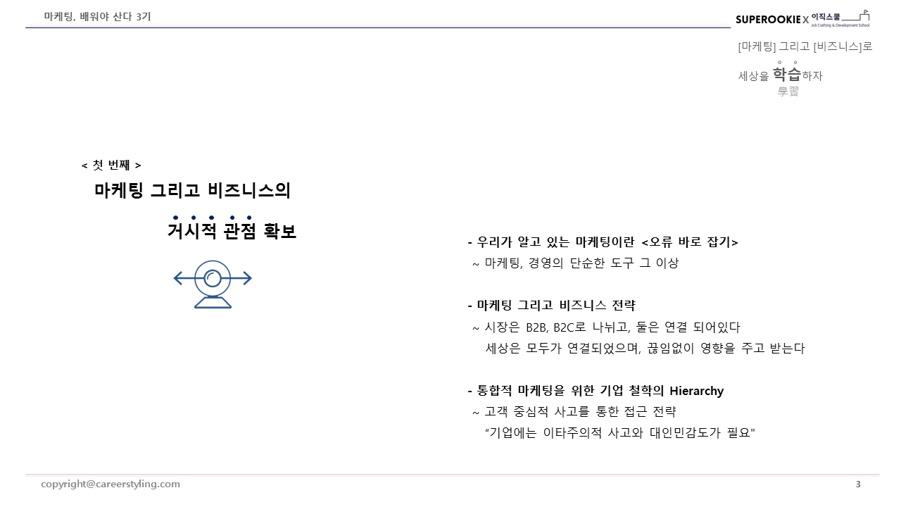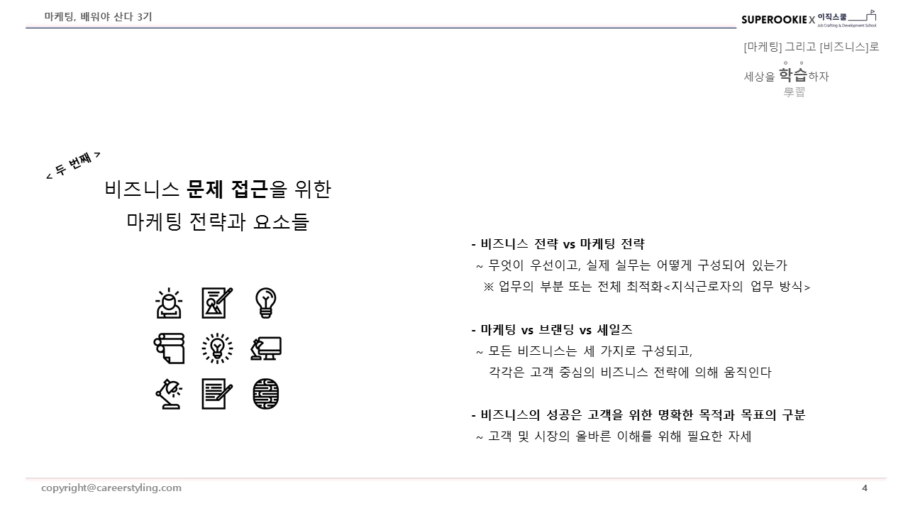 기업의 마케팅, 브랜딩 및 영업 관련 직무를 희망하는 취준생과 현업에서 기본이 없어서 허우적 대는 주니어들을 위해 개설된 마케팅과 비즈니스를 함께 여행하는 수업입니다.