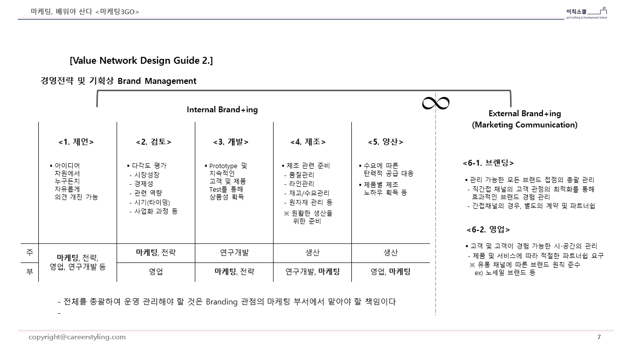 마케팅은 철저히 '마케팅'스럽게 학습해야 한다. 추천하는 방식은 이론을 통해 사례를 보고, 다시 또 사례를 통해 이론을 유추하는 것을 훈련하는 것이다. 이는 (뛰어들지 모르는) 비즈니스를 제대로 이해하여, 주어진 구조나 시스템 속에서 스스로가 만들어낼 가치의 흐름을 파악하기 위함이다. '합리적인 직무 선행학습 방법론' 말미에 언급한 Value Network를 스스로 그리거나, 이미 그려진 시스템 상에 내가 유지 계승해야 할 가치와 발전시켜야 하는 가치가 무엇인지 확인할 수 있는 수준까지는 올라서야 한다.