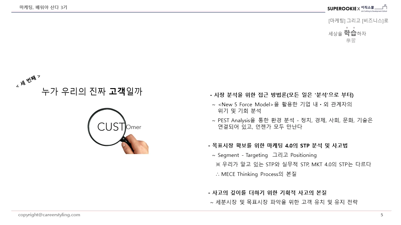 따라서 가장 기본적인 이론을 기반으로 한 총체적 관점의 접근이 필요하다. 기본으로 돌아가 마케팅 이론을 통해 비즈니스를 바라보는 나만의 관점 확립을 위한 학습이다. 당장의 기술적 수준을 높이기 위한 마케팅은 수명이 짧을 수밖에 없고, 새롭게 나온 기술을 익히지 못한 나는 언제든 대체될 수 있기 때문이다.