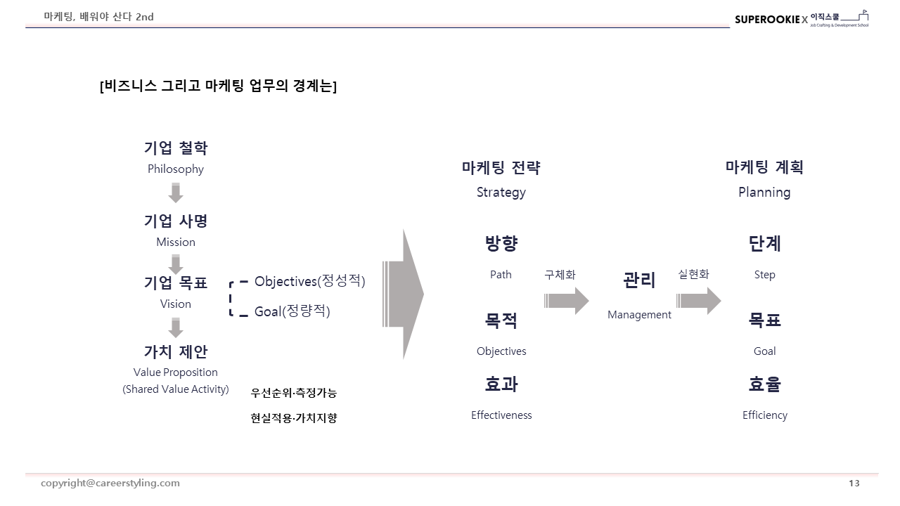 - 그 하위가 ② 마케팅 전략이다. 비즈니스 전략으로 구축된 구조상에서 우리가 각 이해관계자(타 조직)와 어떠한 <관계>를 구축해야지 비즈니스의 흐름(Supply Chain / Value Chain Management)을 최대한 거스르지 않은 차원에서 재정의 하는 것을 말한다. 당연히 우리의 제공 가치(Value Proposition)에 따라서 고객 혹은 최종 고객에게 전달하기 위한 최적의 경로를 찾는 것으로부터 시작된다.