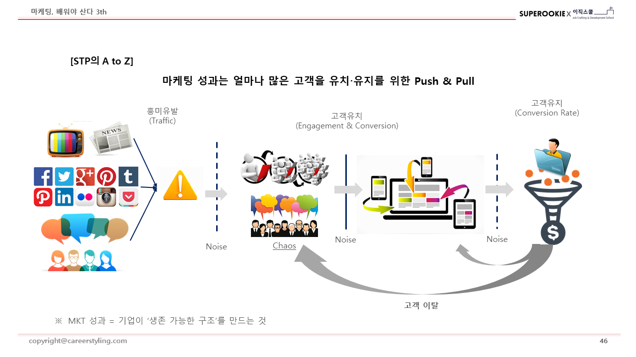 위 S-T-P활동은 '지속'되어야 한다. 쉬지 말아야 한다. 세분화 - 목표화 - 포지셔닝의 순환 과정을 통해 자신들의 고객이라고 불릴 수 있는 진짜 고객을 조금씩 늘려 가는 것이 목표이다. 당연히 그 과정 속에서 매출은 늘어날 것이다. 궁극적으로 고객 Pool을 늘려서 고객과 함께 기업이 성장할 수 있는 기반을 만드는 것이다.