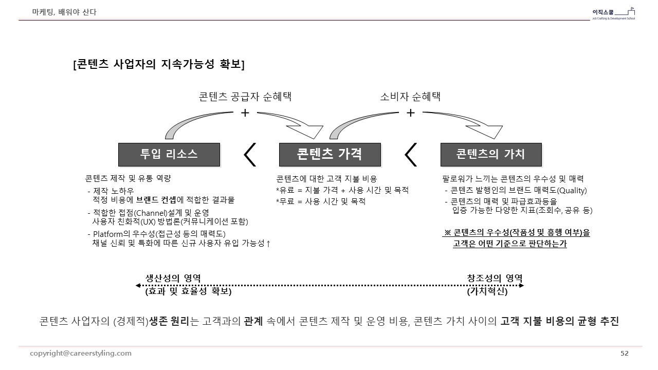 그래서 투입되는 비용(리소스)의 양과 질의 동시 절감과 함께 콘텐츠의 가치가 하락하지 않는 것을 전제의 꾸준한 콘텐츠 개발 활동이 전체 비즈니스의 균형축이 되어야 한다. 또한 고객 가치 지향의 활동으로 체류시간 또는 주변에 추천 등의 Loyalty를 확인할 수 있는 활동을 이어가야 하는 것이다.