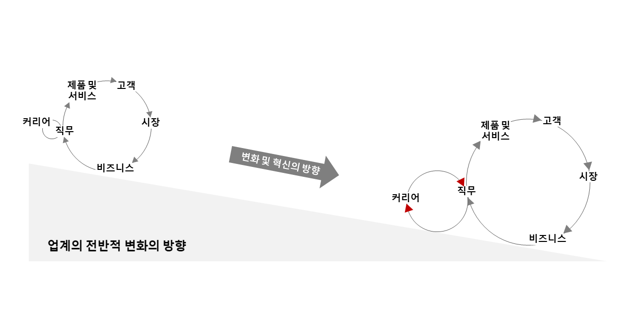 위의 각 요소는 '커리어'에 크고 작은 영향을 주는 관계에 있다. 특히, 몸 담고 있는 업계가 고객과 시장의 영향 속에도 지속 생존하면서, 그 수혜를 직무가 그대로 입고, 적응하며 얻게 된 (직무상) 전문성이 곧 커리어를 결정하게 된다.