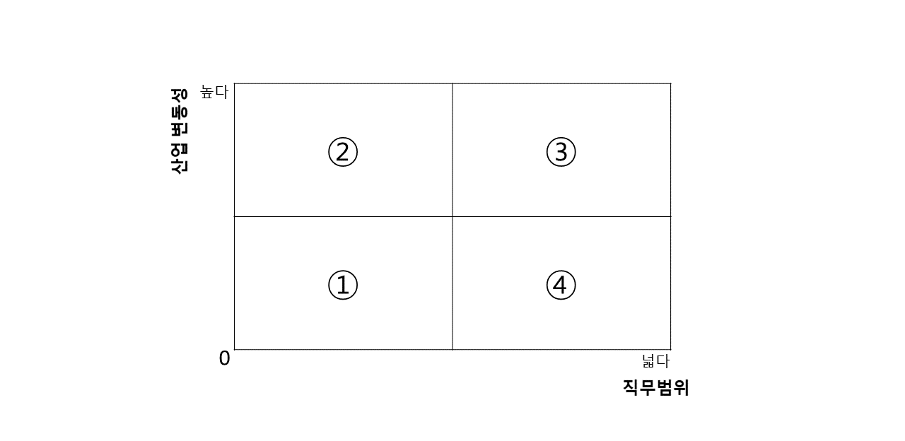 이때, 직무 범위가 좁다면, 자칫 적응이 어려울 수 있다. 기존에 만들어놓은 전문성에 유연성이 적절히 자리 잡아 있지 못하다면, 새롭게 나타난 영향에 이전과 같은 성과를 내기 어려울 수 있다. 또한, 이직은 ①의 경우에 비해 다소 어려울 수 있다.