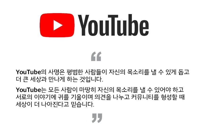 누구든지 자신의 이야기를 영상 및 음성으로 담을 수 있도록 가장 크고 강력한 TV를 만들었다.(유튜브)