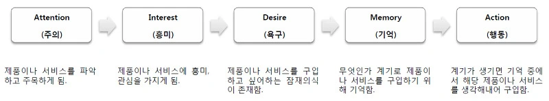 브랜드의 입장에서 목표한 고객에게 노출(광고 및 캠페인)되어, 그들의 눈에 익고(Attention), 호감이 쌓이고(Interest), 그들의 욕망을 자극하고(Desire), 일시적 경험 및 체험을 통해 기억하고(Memory), 여기에 충분한 호감이 쌓을 수 있는 계기를 마련하는 것(행동 디자인)을 뜻한다. 그리고 이것이 최종적으로 Action으로 이어질 수 있도록 영향을 미치는 것이다.