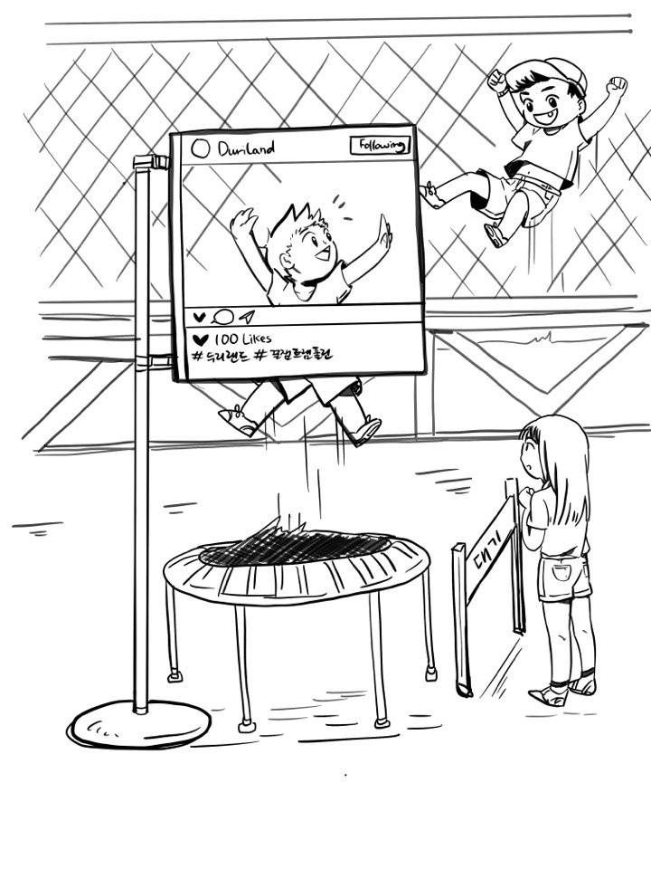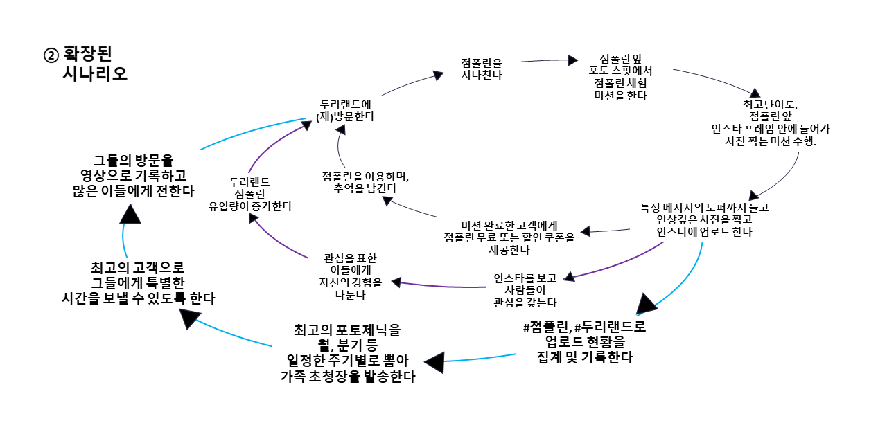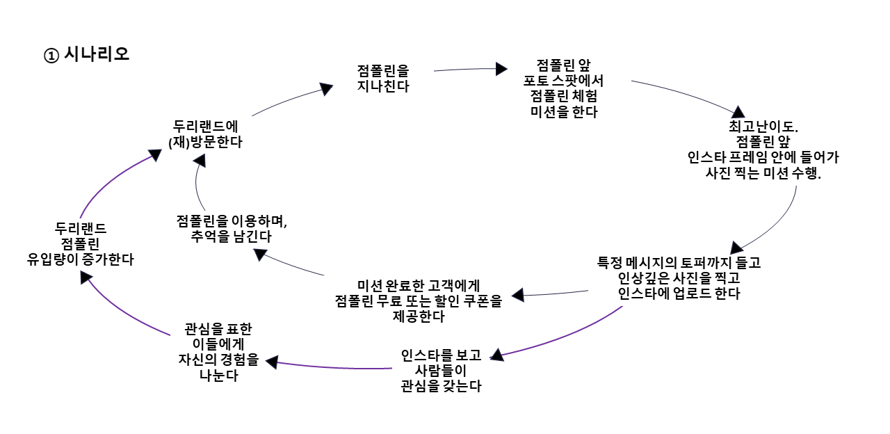 해당 게시물은 그들의 팔로워에게 전파되고, 그 경험이 하고 싶은 이들의 두리랜드 방문이 이어진다. 물론, 이를 강제할 수 있을만한 장치는 없다. 따라서, 이를 촉진하게 만들기 위한 추가 시나리오가 필요했다.