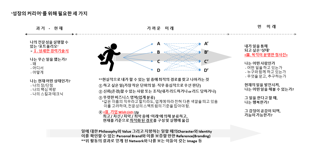 이를 제외하고, ① 하고 싶은 일(가장 작은 단위의 일- 직무 중심적으로 우선 판단), ② 신뢰(존경)할 수 있는 사람 또는 조직(리드하거나 or 리드당하거나), ③ 뚜렷한 비즈니스 영역(업계 분류)을 통해 리스트를 뽑고, 나만의 기준에 의해 세 분류하고, 경로를 설정해보는 것이다.