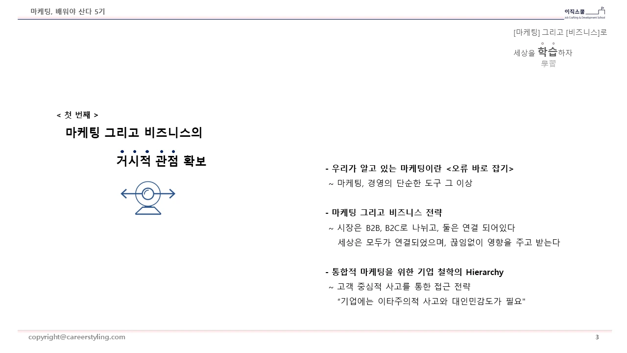그 중심에 '비즈니스 또는 마케팅에 대한 안이함'이 있습니다. 실제 포함된 시장에서 시장의 기본 원리가 무엇이고, 그 원리에 의해 우리는 어디로, 어떻게 해야 하는지 답을 내려야 합니다. 그 답을 찾는 과정 속에 스스로 커리어를 설계할 수 있는 눈과 귀가 열리고, 이를 실행으로 옮길 수 있지만, 원리를 몰라서 대부분 해맬 뿐입니다.
