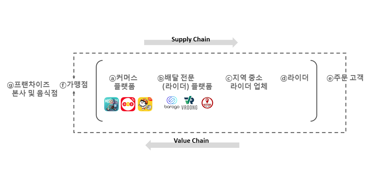 최초는 A <프랜차이즈를 포함 음식점>와 B <음식을 시켜먹으려는 일반 소비자> 사이에 들어가, Mobile App을 활용하여 지역 기반 접속으로 '손쉬운 거래'를 할 수 있도록 만들었다. 점차 시장 속 참여자가 '레버리지 효과'에 의해 늘어나기 시작했고, 곧이어 다른 유형의 인접 플랫폼 사업자가 C <배달 기사를 A와 연결하는 이들>가 시장에 출현하여 사업자 등의 고충 <배달 기사의 직접 고용의 부담> 등을 해결하기 시작했다.