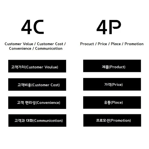 그러다 보니, 고객(Customer)이라는 말을 매우 강조하고 4P와 유사한 4C라는 개념을 만들어 사용했다.