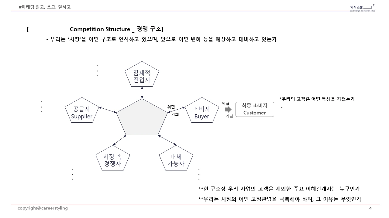 **경쟁사, 대체사, 잠재적 진입자 등은 '모 회사' 기준과 앞서 정의한 고객의 관점에서 정의가 달라질 수 있으니, 이를 주의해야 함(되도록이면, 정의된 고객의 관점에 의한 해석이 필요)