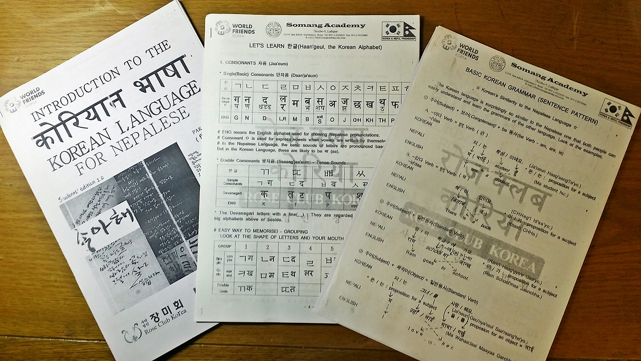 현지 적응을 마치고 4월부터 나는 학교에서 근무를 시작했다. 우리나라의 지원으로 설립된 종합학교인 소망아카데미(Somang Academy)에서 한국어 수업을 맡은 것이다. 기본적인 의사소통은 영어로 이루어졌으나, 나이가 어린 초등학생 반에 갈 때나 네팔어와 상당한 유사성을 지닌 한국어 문법을 설명할 때는 되도록 네팔어를 쓰려고 노력했다. 기본적으로 어린 학생들은 한국에 대해 잘 알지는 못해도, 흔치 않은 '외국인(bidesh) 선생님'에게 큰 관심을 가지고 있었고 내가 엉뚱한 네팔어를 할 때마다 깔깔거리며 웃어주었다. 비록 어린 학생들이었지만 우리말을 가르치면서 한국에 대해 알리는 것은 보람차고 재미있는 일이었다. 심지어 수업 시작 한 달 만에 직접 기초 한국어 교재를 만들고, 200명이 넘는 학생들에게 줄 교재를 인쇄하는 비용을 내 자비로 충당할 정도로 열정이 넘쳤다. 교재까지 만든 김에 아예 동네 한국어 교실을 열어 관심 있는 청년들을 모아 일요일마다 무료로 한국어를 가르치기도 했다. 5년 넘게 연락하고 지내는 내 가장 친한 네팔 친구 비카스(Bikash) 역시 여기서 만났다.