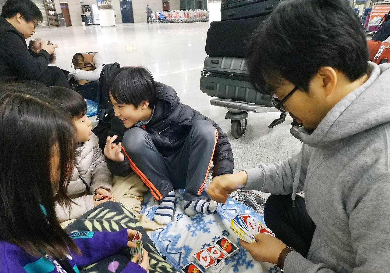 우리가 선택한 방법은 두 가지. 각종 보드 게임과 카드 게임으로 무료함을 달래고 공항 식당들이 문을 열면 남은 중국 돈 다 쓰기였다. 만반의 준비를 했다. 바닥에 깔 자리, 게임용 각종 카드, 추위를 이겨줄 은박지 이불(부스럭 소리가 거슬리지만 무게 대비 보온성이 크다), 노트북에 안 본 영화 몇 편을 챙겼다. 그리고 세 아이들의 고향 같은 땅, 인도에게 안녕을 고하고 한국 행 비행기에 올랐다.