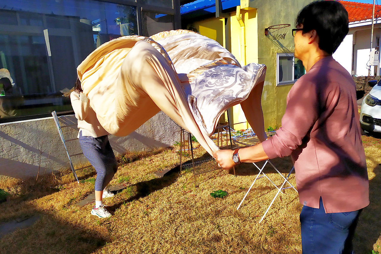 다행히 냉장고 상태는 양호했다.(휴~ 사실 이게 제일 걱정이었다) 마당에서 모든 침구류의 먼지를 털고, 빨고, 일광 소독하고, 집안 구석구석 먼지를 닦고, 분리수거까지 하고 나니 하루 해가 저물었다. 내일부터 시작될 제주에서 일주일 일상 살기가 설레는 건 5학년 막내뿐만은 아니리라.