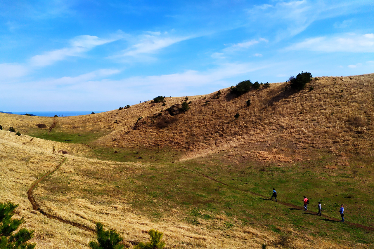 대망의 마지막 오름은 용눈이 오름이었다. 단단한 각오를 하고 있었다. 그런데 웬걸! 정상에 올라가는 길은 1도 힘들지 않았다. 오히려 산책로처럼 되어있어서 그냥 평지를 걷는 것 같았다. 그리고 옆에는 금빛 털을 한 말들이 풀을 뜯고 있는 모습을 보니 마음도 평온해졌다. 그렇게 정상 즈음에 도착해 보니 중간에 화산의 흔적 같은 넓은 구멍 같은 분화구들이 있었다. 그런데 그 구멍에는 우리를 유혹하는 파란 풀들과 예쁜 꽃들로 가득했고 저 멀리에는 바다가 보였다. 그곳을 걸으면 마치 한 편의 영화를 찍는 기분일 것 같았다. 그런데 자세히 보니 작은 길이 나 있었다. 그래서 우리는 아싸뵹 기회다! 싶어서 그곳을 걷기로 했다. 하지만 아빠는 그냥 평탄하게 닦인 분화구 옆 길을 선택했다. 그래서 우리들만 그 아름다운 길에서 우리만의 영화를 찍기로 했다.