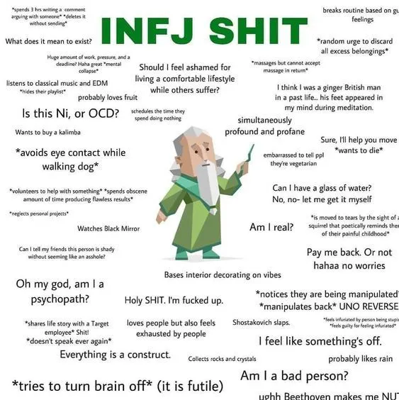 INFJ로써 내가 내린 결론은, ‘차분한데 은근 똥고집이 센 사람’이다. 남들이 괜찮은 충고나 조언을 해주면 우선 ‘좋은 얘기 너무 고마워 헤헤 ^^....’ 하며 상황을 회피한다. 하지만 대부분 다 흘려듣고 마이웨이를 가게 되는데, 말이 좋아 정신적 지도자지 일반적인 레벨의 INFJ들은 사서 고생하는 경우가 많다. 분명 근거가 없는 건 아닌데 어딘가 두루뭉술한 자신감들이 튀어나온다.