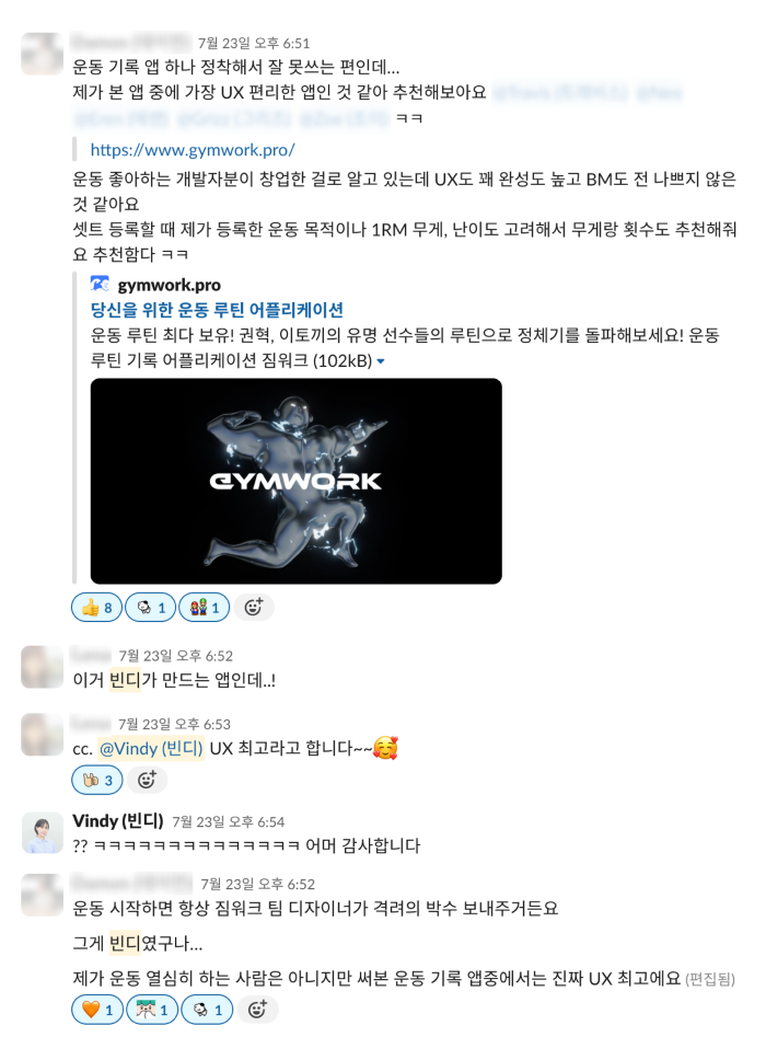 당근마켓 팀원들 중에서도 꾸준히 쓰시는 분들이 있는걸 보고 정말 뿌듯했고 유저 인터뷰도 여러 명 할 수 있었다. 그러던 어느 날 다른 팀 채널에서 짐워크가 레퍼런스로 공유됐을 때 디자이너로서 정말 짜릿했다.