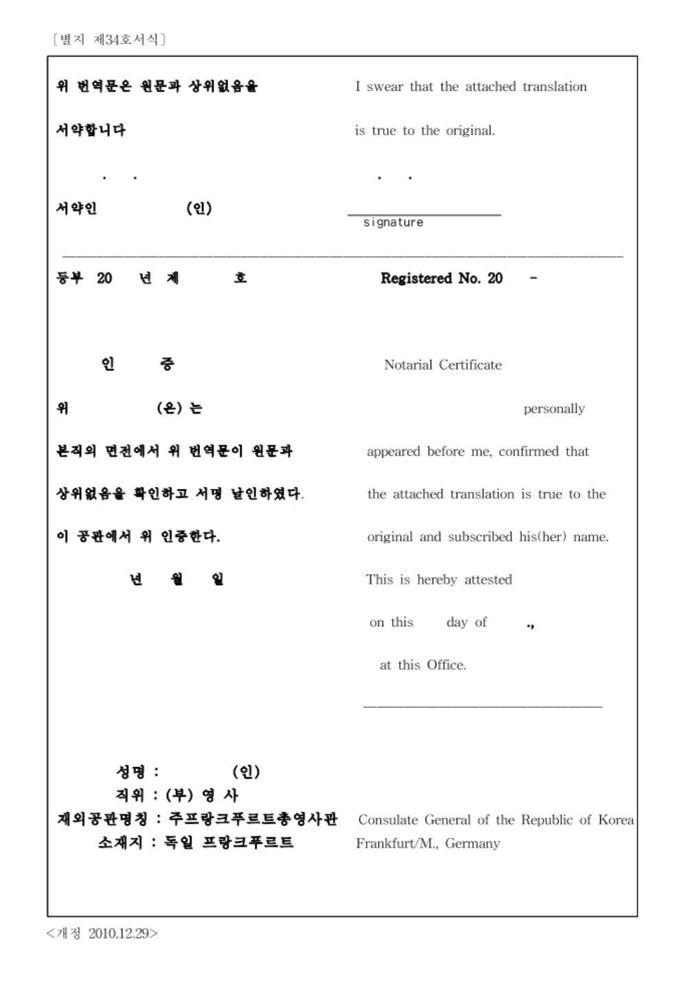 ** 번역문은 주소도 한글 발음으로 한글로 작성하는 것이 좋다. 예를들어 Berlin이라고 쓰지 말고, 베를린이라고 한글로 작성하는 것을 권장한다.