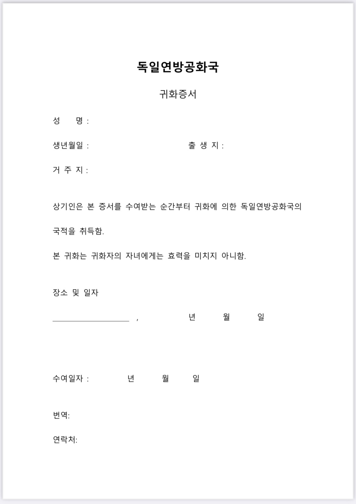 이 독일 귀화증서가 한국에서 요구될 경우에는 번역본이 필요하다. 이 번역본 양식은 독일 영사관에서 파일을 찾아볼 수 있다. 번역은 본인이 직접 하는 것으로 번역자는 본인 이름을 적고, 대신 이 번역본에 대한 영사관의 확인 도장을 받아 적법성을 증명할 수 있다. 다만 이때는 번역본이 원본과 다름이 없음에 대해 서명한 것에 대한 인증인 것이고, 번역 내용이 정확하다는 것에 대한 보장은 아니다.