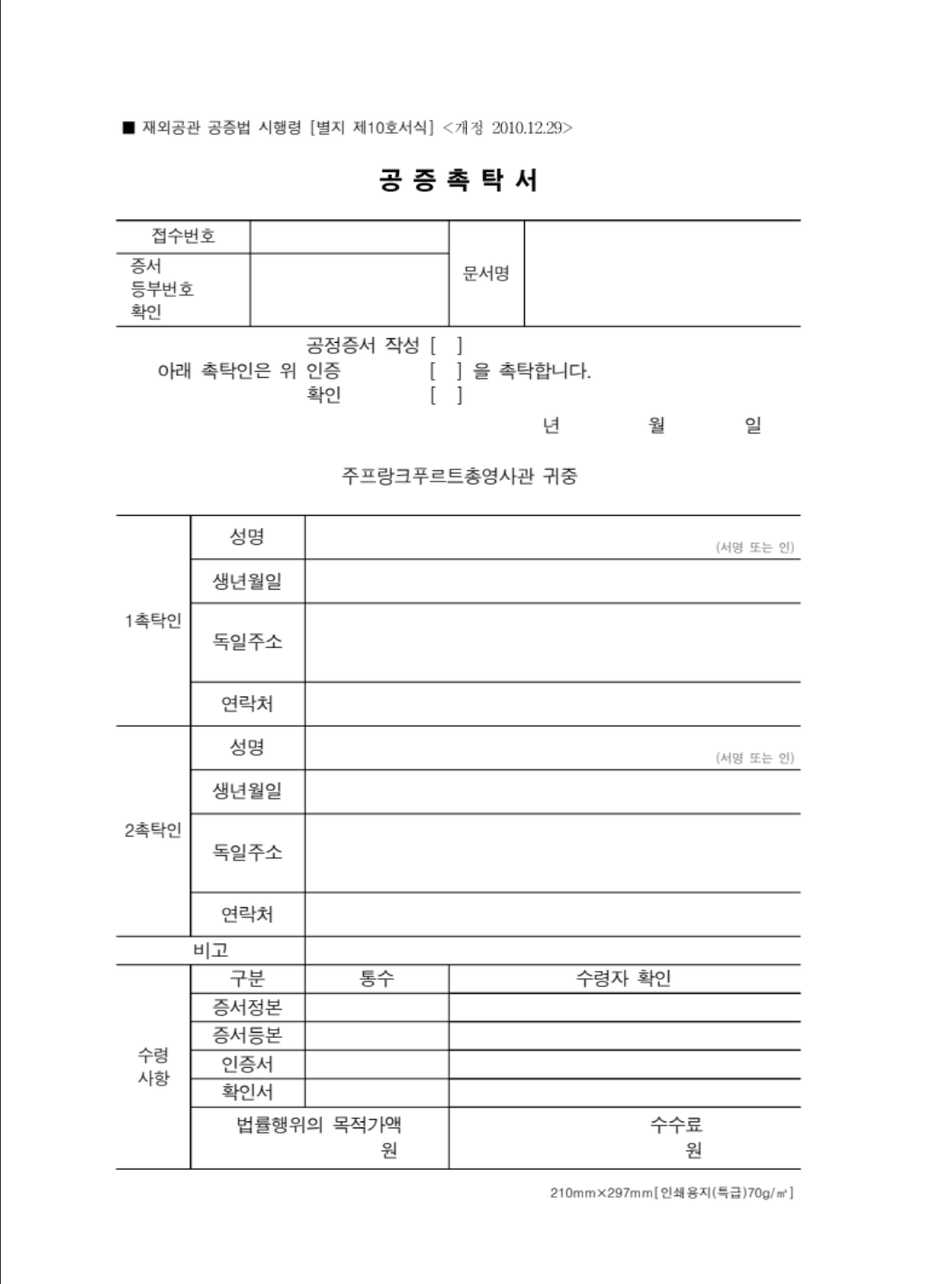 촉탁이란 공증업무시 공증을 "의뢰 또는 신청"하는 행위를 말하며, 따라서 영사관에 공증을 의뢰 시 재외공관공증법에 의거하여 반드시 공증 촉탁서(신청서)를 신청인이 작성하여 공증받을 서류와 함께 제출하여야 함. 공증촉탁서에는 필히 문서명, 날짜, 촉탁인의 성명 및 서명, 주소를 기재