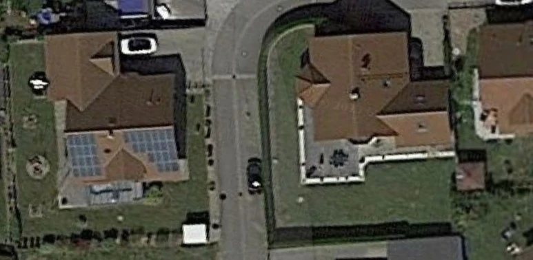 위성사진으로 보면 도로가 안쪽으로 집을 잘 감싸고 있다. 집을 고를 때 굽은 도로의 안쪽에 자리 잡은 집이 자동차의 이동 방향, 매연, 바람의 방향 등을 고려했을 때 더 장점이 많다. 붙어 있는 집이라고 하더라도 도로의 바깥쪽에 자리 잡고 있는 집보다는 풍수적으로도 안정적이라고 볼 수 있다.